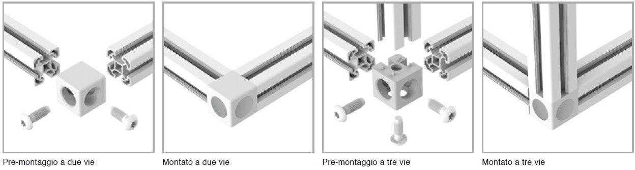 Giunti per collegamenti di testa tra profili. Disponibili nella configurazione 2 e a 3 vie completi di tappi di finitura.