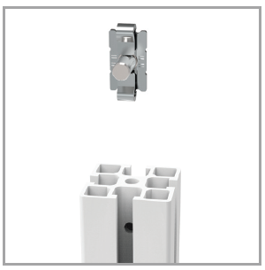 Elemento di collegamento tra profili ortogonali con impedimento di rotazione relativa in acciaio zincato.