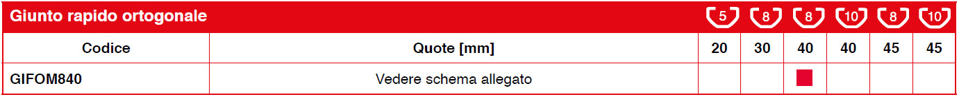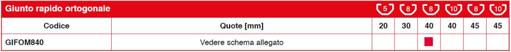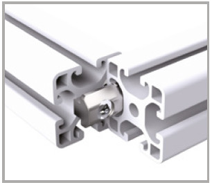 Giunto per collegamenti rapidi tra profili ortogonali. Il montaggio non richiede lavorazioni meccaniche ed il serraggio si perfeziona attraverso il tiraggio di un grano M8 (chiave esagonale 4)