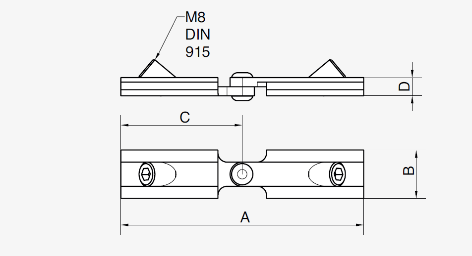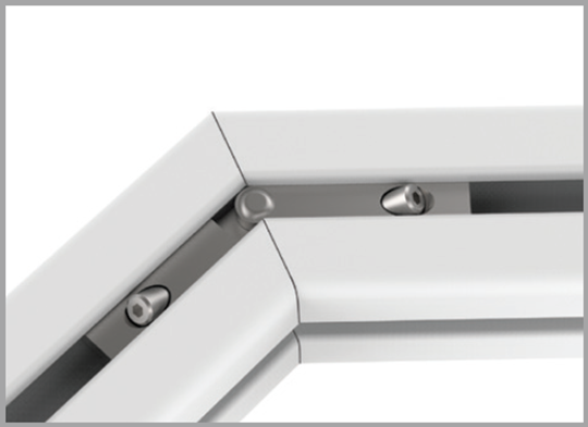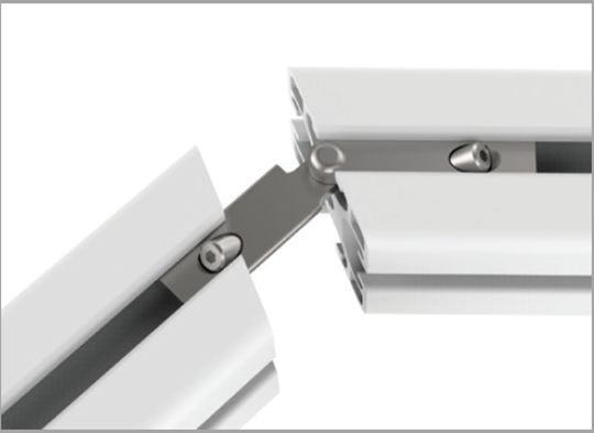 Giunto snodato in acciaio zincato per la realizzazione di collegamenti ad angolo variabile tra profili tagliati a gradi e giuntati in testa, senza necessità di lavorazioni meccaniche.