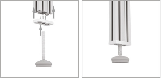 Piastra per fissaggio piedini su profili sprovvisti di foro centrale per la maschiatura. I fori lamati permettono il fissaggio all’estruso, mentre il foro centrale è filettato per avvitare il piede di sostegno.