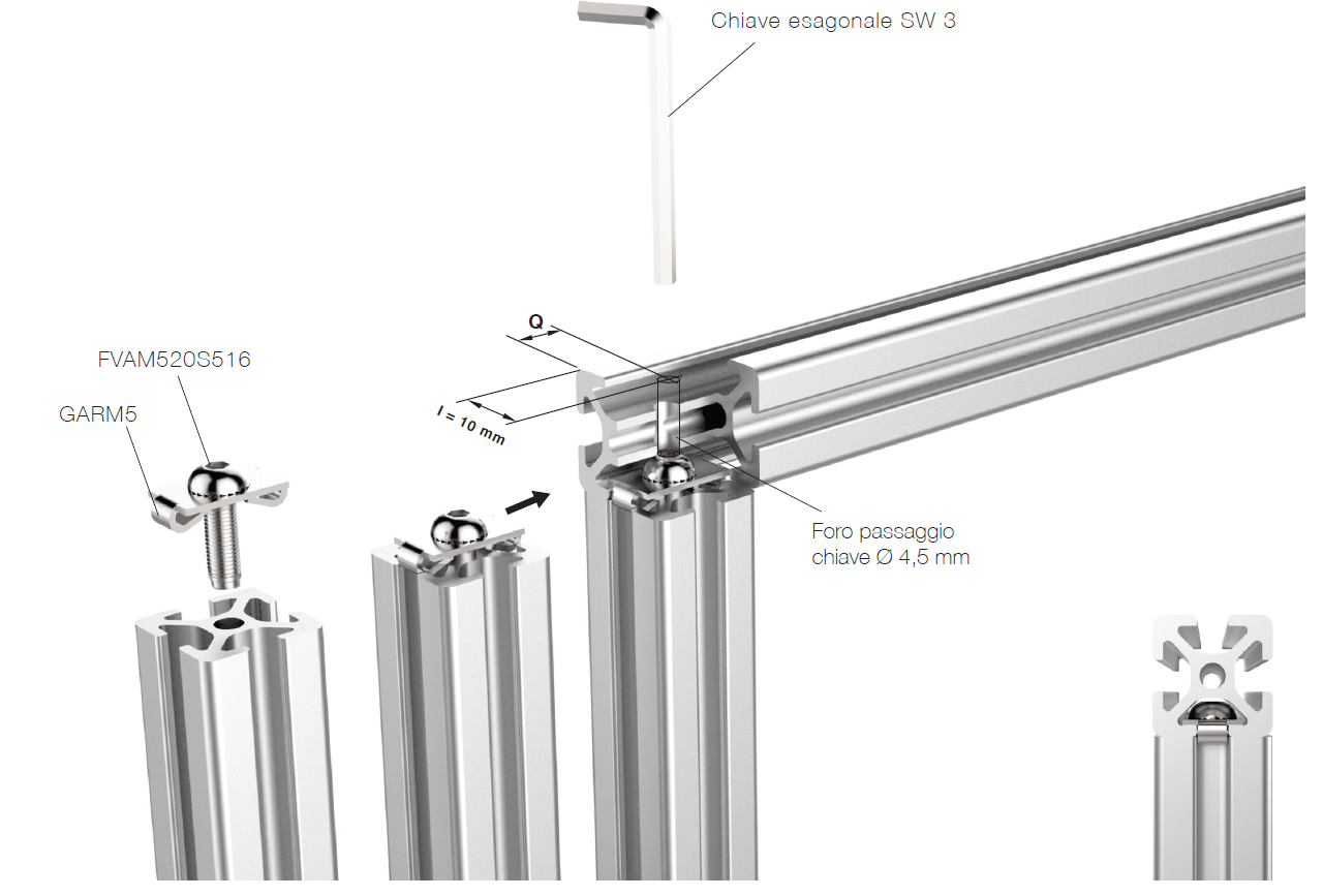 La quota Q del foro passante deve essere uguale all’interasse I della cava del profilo di appoggio ditesta, ovvero al centro della cava. Successivamente bisogna far scorrere la testa della vite nella cava del profilo dove è stato realizzato il foro per il passaggiodella chiave e serrare la vite.