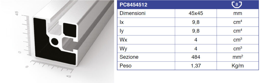 Per la serie 45 cava 8, una prima modalità di giunzione tra profili si realizza maschiando il foro centrale della sezione e avvitandoci una vite a testa cilindrica.