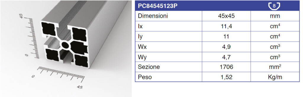 Per la serie 45 cava 8, una prima modalità di giunzione tra profili si realizza maschiando il foro centrale della sezione e avvitandoci una vite a testa cilindrica.