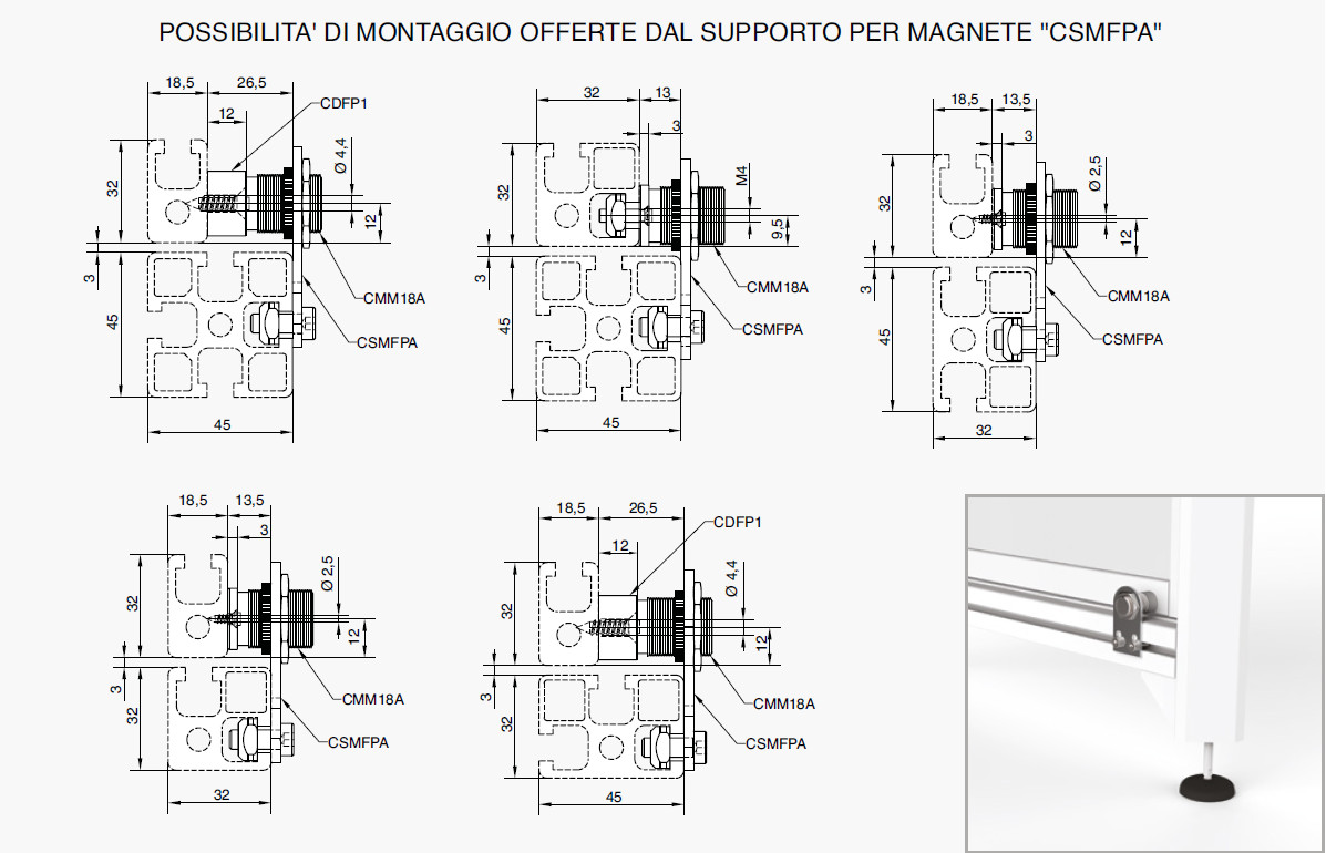 Battuta fermaporte ,in abbinamento al magnete CMM18A e, dove richiesto (vedi schema di montaggio), al distanziale CDFP1