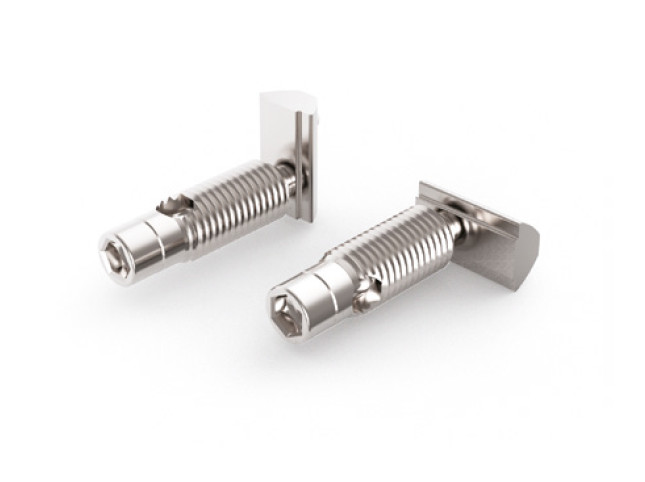 Il giunto snodato a vite permette di realizzare giunzione ad angolo variabile; serrando o allentando le viti si può variare in modo continuo la forza di attrito esercitata nel giunto, oppure fissare i profili ad una posizione specifica. Sono dotati di tasselli anti-rotazione adattabili a profili con larghezza cava diversa.