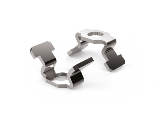Elemento di collegamento tra profili ortogonali con impedimento di rotazione relativa in acciaio zincato.
