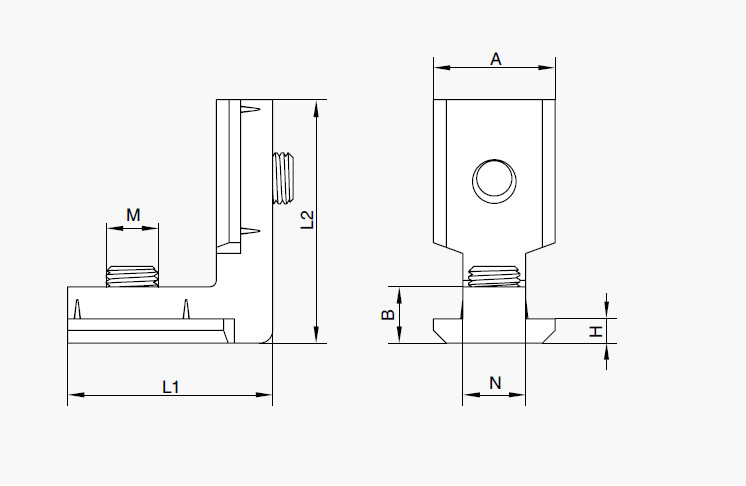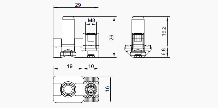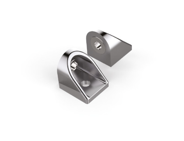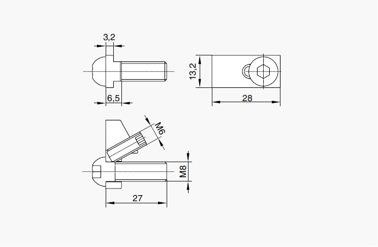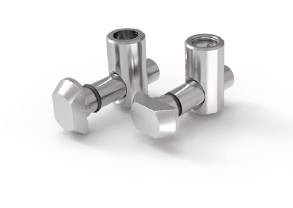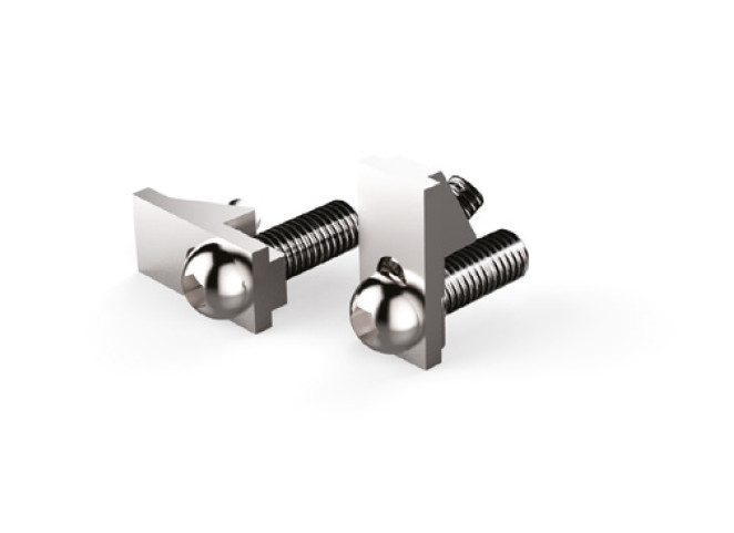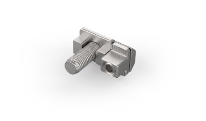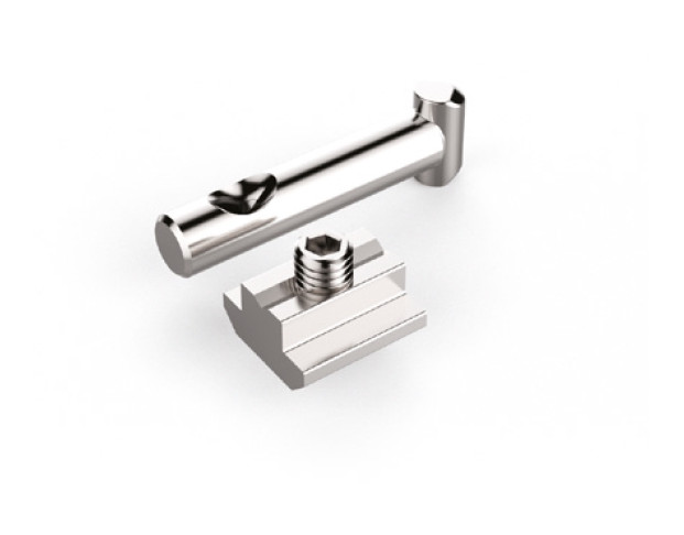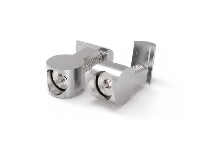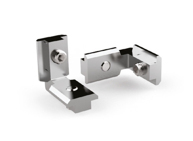 Giunto per collegamenti rapidi tra profili ortogonali. Il montaggio non richiede lavorazioni meccaniche ed il serraggio si perfeziona attraverso il tiraggio di un grano M8 (chiave esagonale 4)