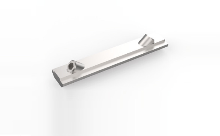 Elemento di giunzione in acciaio zincato per il collegamento di testa tra due profili in alluminio, senza necessità di lavorazioni preliminari.