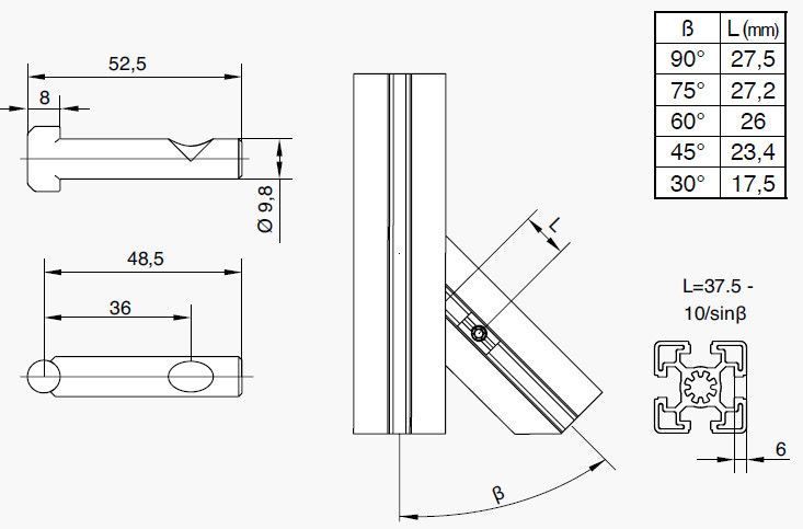 Giunto per collegamenti tra profili a taglio obliquo con angolo variabile (da 30° a 90°). È richiesta una foratura per passaggio grano Ø 8.2 mm a distanza L variabile a seconda dell’angolo.