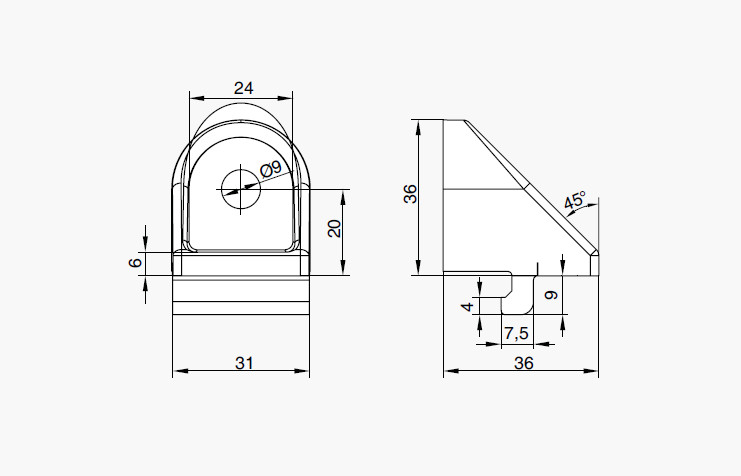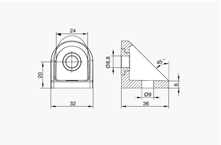 Il giunto angolare permette il posizionamento reciproco tra profili ad un angolo fissato di 45°